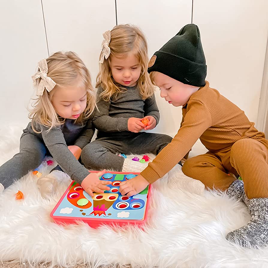 🐞Start by matching and snapping the mushroom nails to the illustrated pattern cards to complete the picture, then move on to creating own unique designs by only using the mosaic pegboard! Let your kids have imagination time.