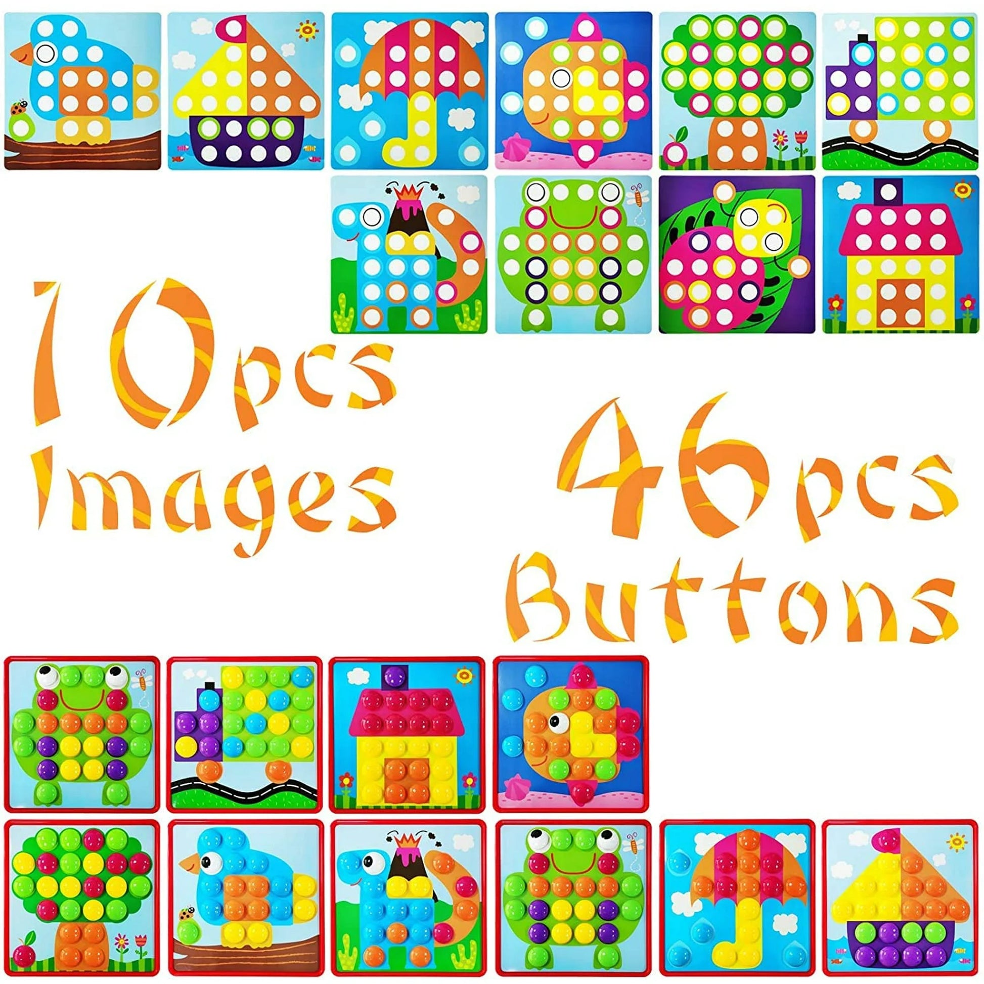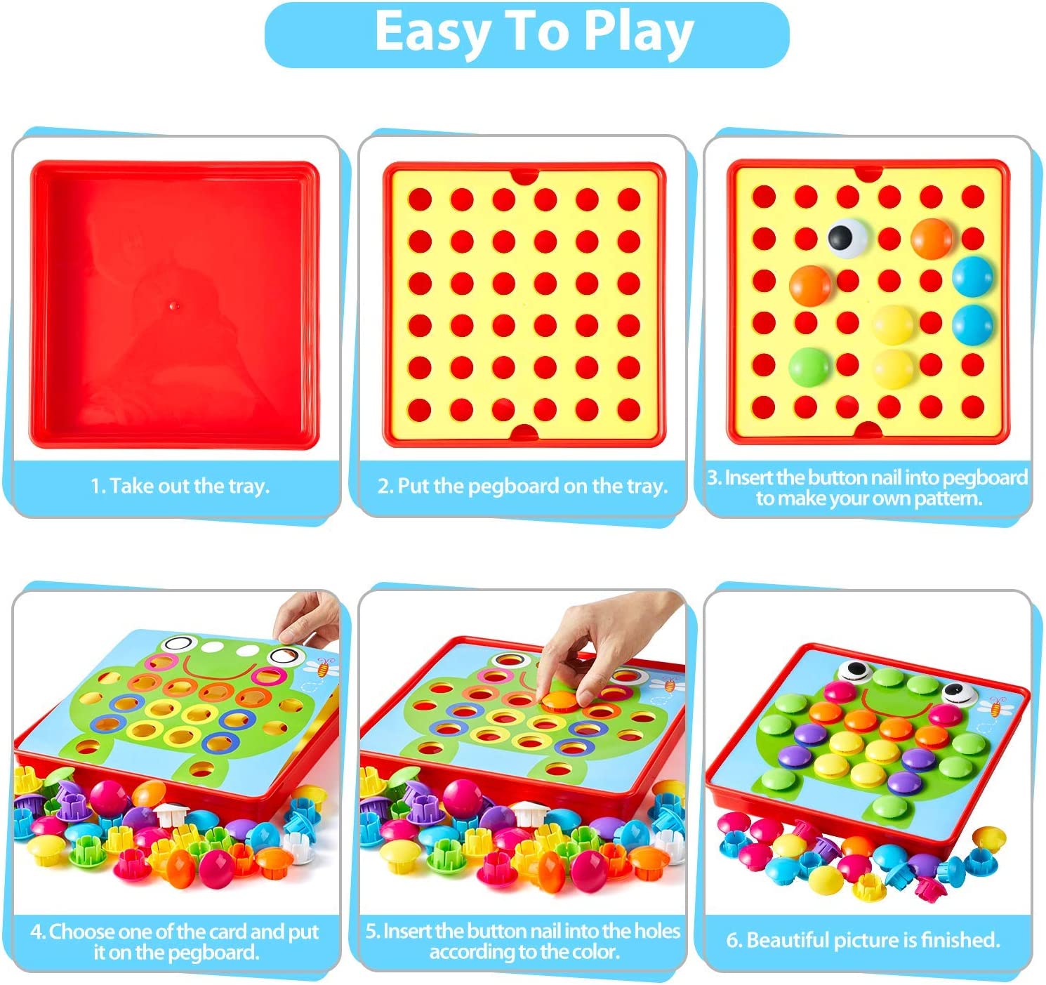 🎁Storage box*1+pieced paper*12+mushroom pegs*46, The colourful pictures and various shapes can attract the kids instantly, so that the button art toys will be a wonderful surprise as birthday ,Thanksgiving or Christmas gift.